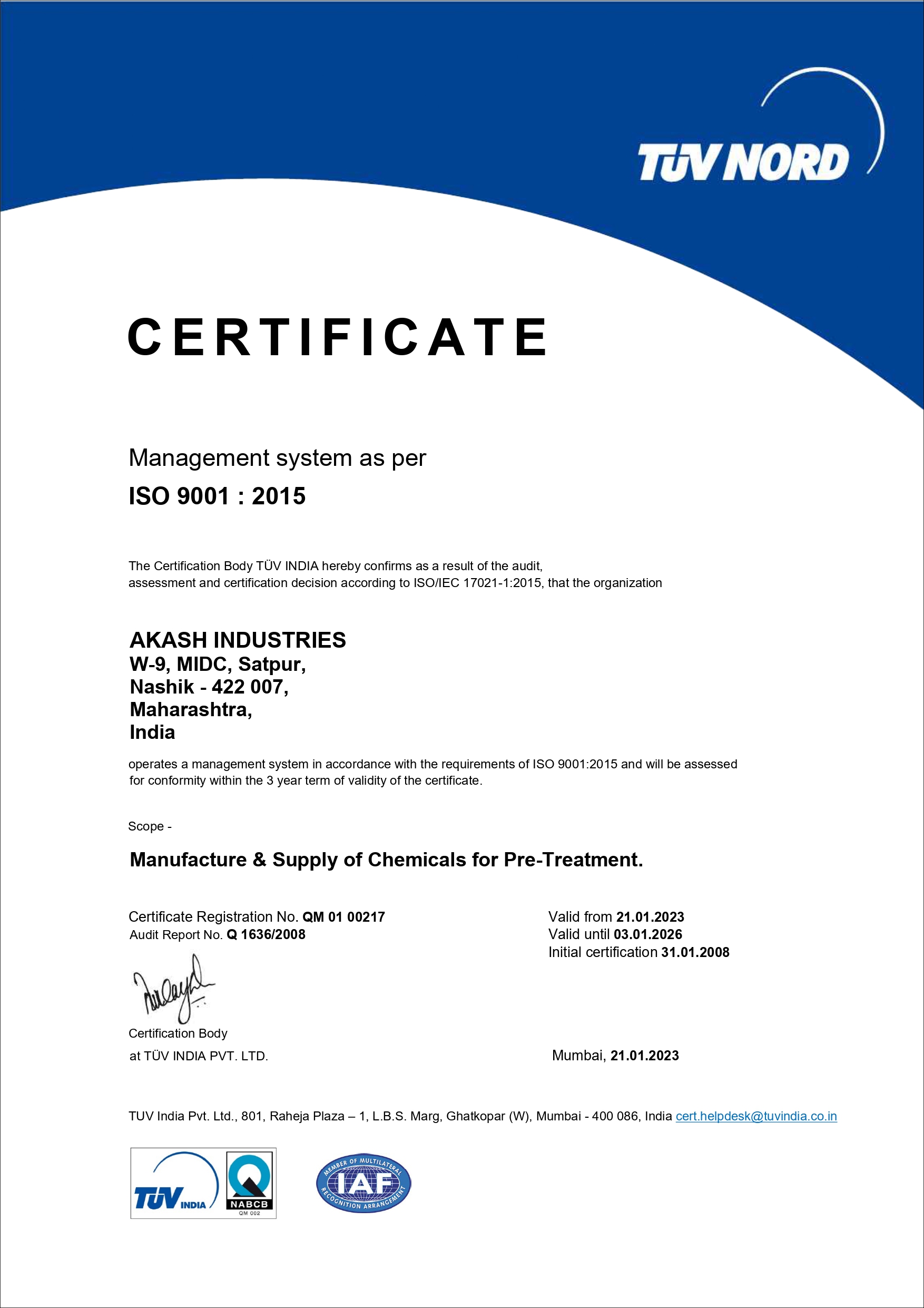 We at akash industry will manufacture surface treatment chemical’s for powder coating industry with consistent quality by using quality raw material, quality management system, advance technology. Continual changes in product as per market requirement providing on time delivery and service by proper supply chain.